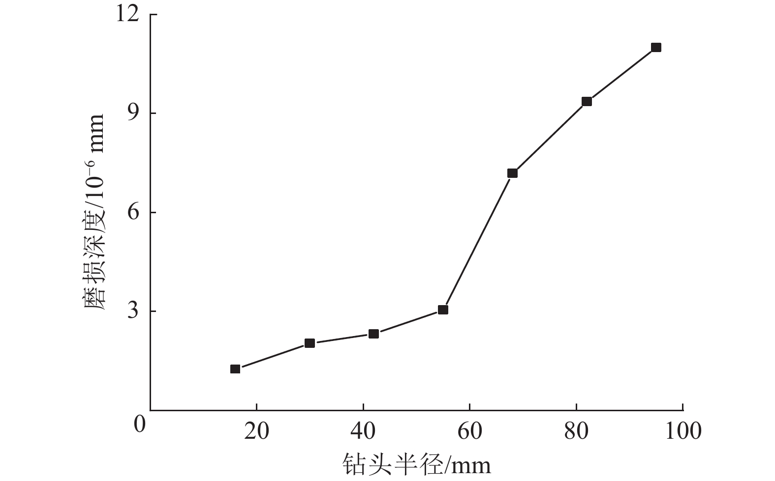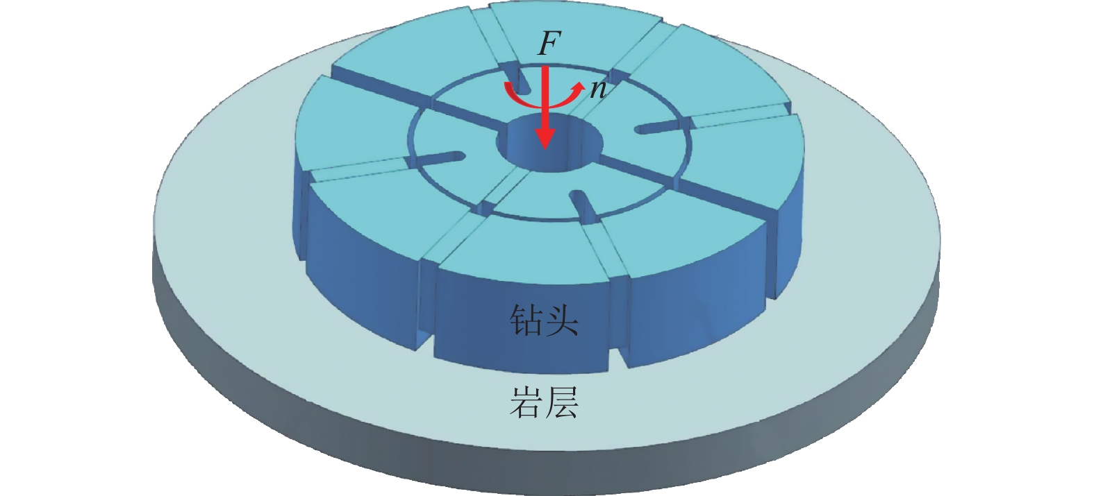 −6 mm, respectively. When the radius of the bit lip is 55 mm, the bit wear speed changes. Then, a two-stage assembling non-coring drill bit was designed based on the numerical simulation results, consisting of an outer ring drill bit, a center drill bit, and a waterway system. The outer ring drill bit is in the size of ø95/48 mm, the center drill bit is sized ø46/16 mm, and the waterway system consists of a center hole, 4 main waterways, 4 auxiliary waterways and an annular gap waterway. Meanwhile, the bit matrix formula, diamond parameters and sintering process were designed based on the common drillability of 7‒8 grade rocks. To improve the wear resistance of the outer ring bit matrix, the diamond concentration, the proportion of small diamond particles, the sintering temperature and the sintering pressure were increased to a certain degree, thereby reducing the wear of the outer bit and ensuring the wearing consistency between the outer and inner bits. Besides, laboratory drilling test was carried out on the granite of grade-8 drillability with the designed ø75/16 mm two-stage assembling non-coring bit. The experiment results indicate that the bit is worn evenly, the rate of penetration is about 1.84 m/h, and the matrix consumption height is about 1 mm, which can meet the needs of full drilling in hard rocks. Generally, this research provides reference for the design, development and construction of non-coring impregnated diamond bit.