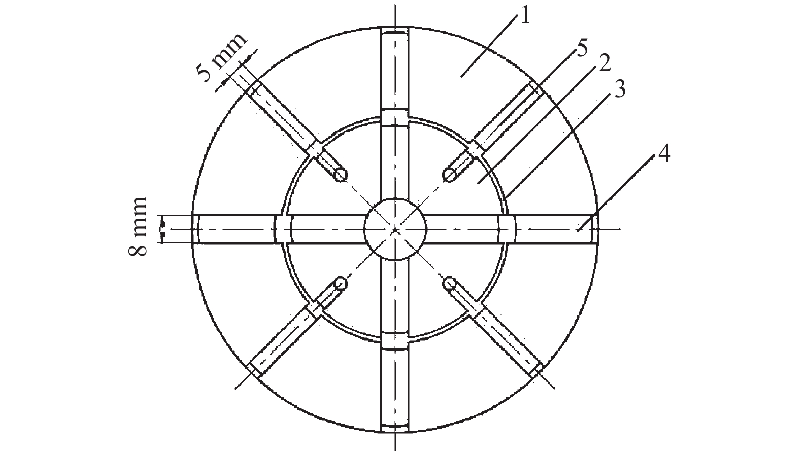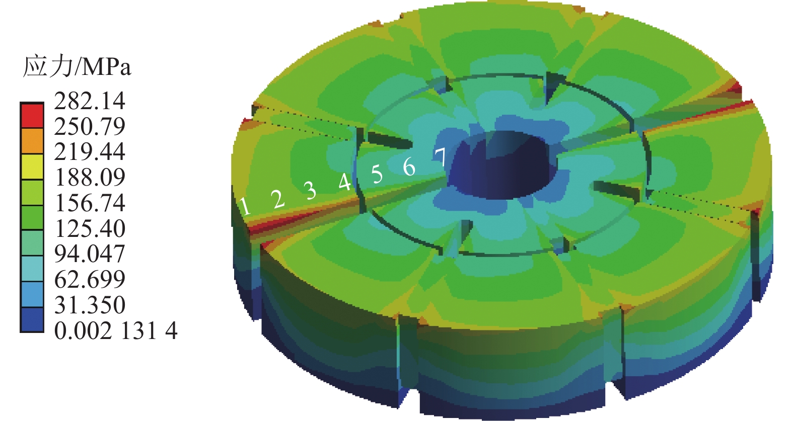 −5 mm respectively, while the minimum value near the center of the drill bit, which are 0.002 MPa and 1.3×10