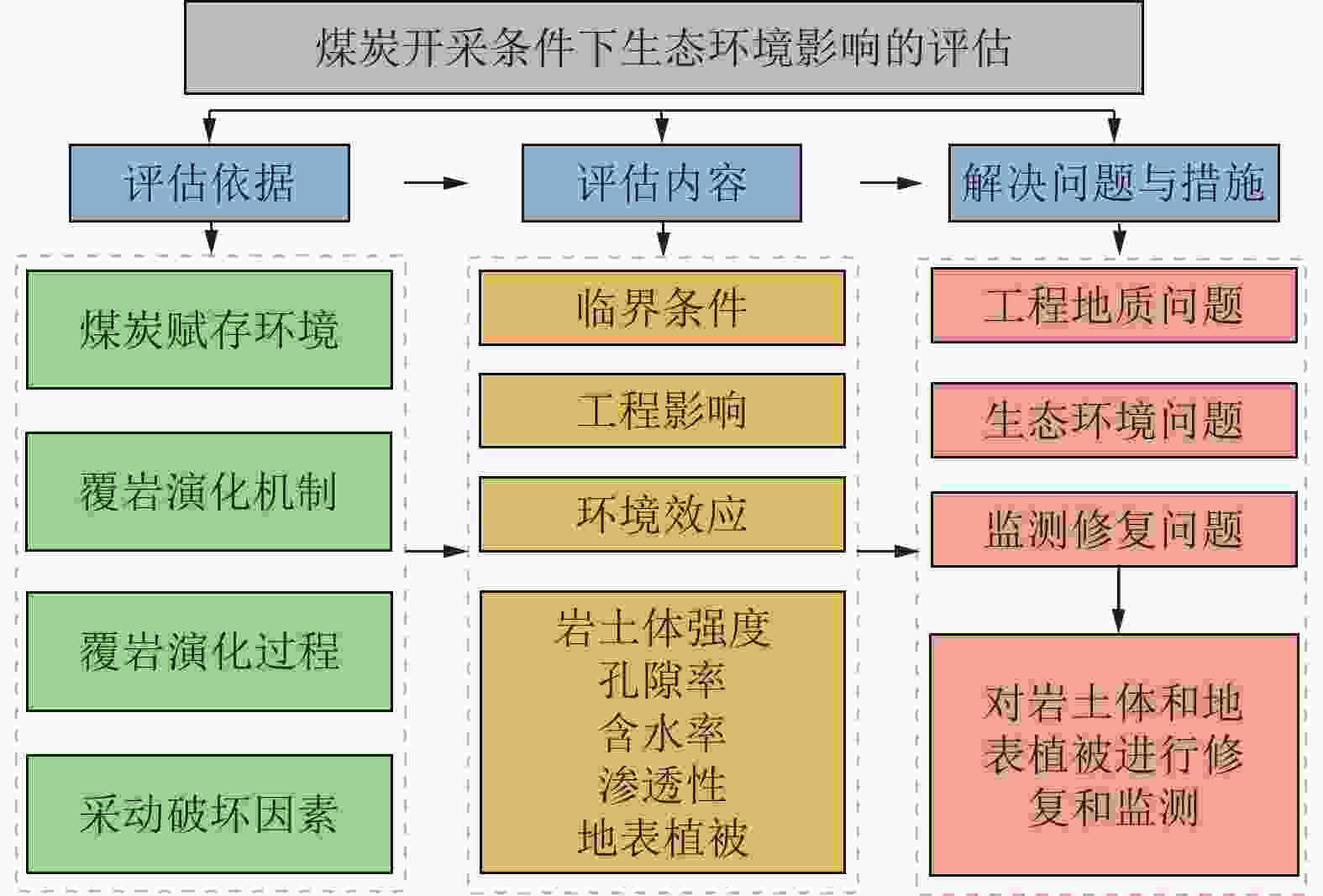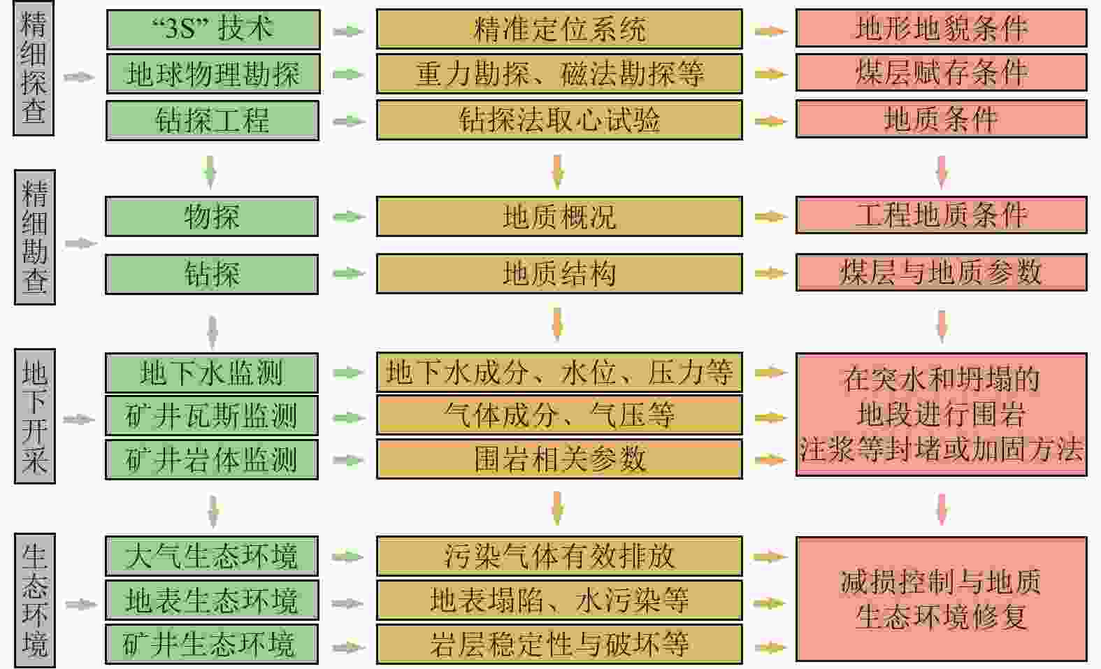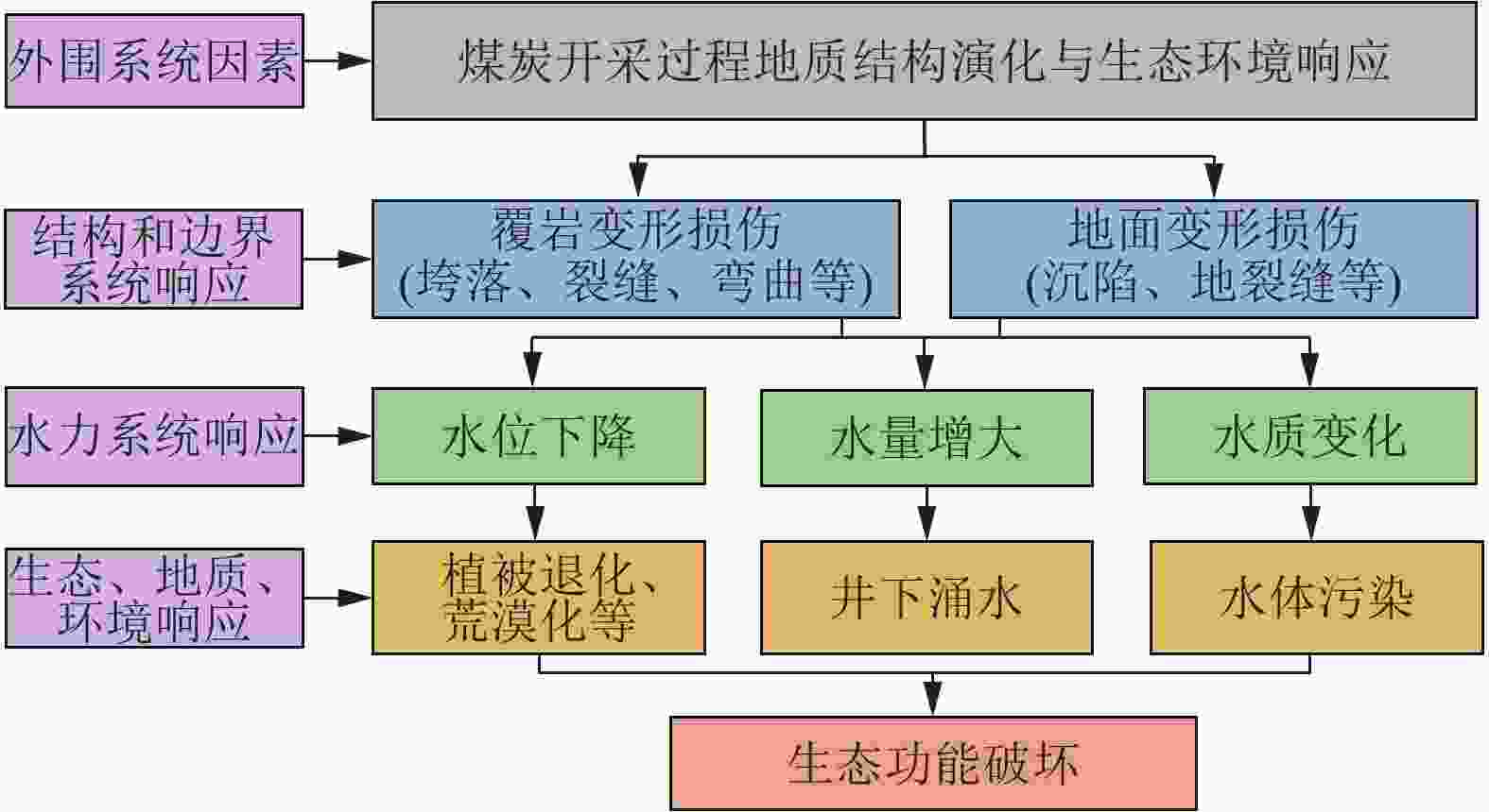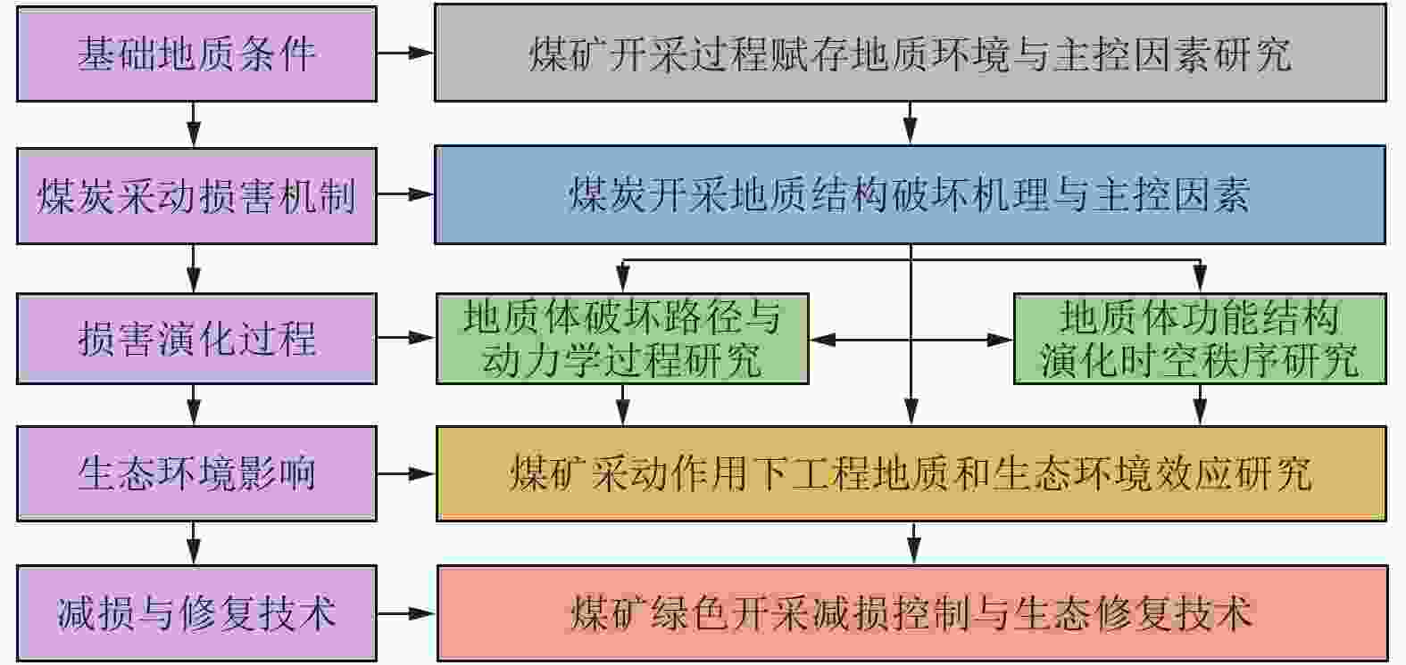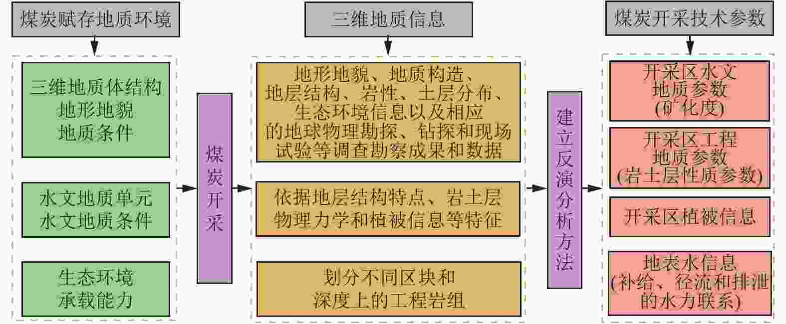 Large-scale and high-intensity mining of coal resources has induced damage to geological conditions and ecological environment in coal mining areas. It is of great significance to study the coupling mechanism of geological structure-groundwater environment-ecological environment dynamic evolution caused by coal mining. Development of the theory and technology of geological guarantee for green coal development is also critical for ensuring the high-quality development of coal industry in China. In additional to the current coal mining technology, research status of geological guarantee for green development of coal is analyzed in this paper Scientific connotation of “system of geological guarantee for green development of coal” is proposed. Specifically, the following aspects are mainly included in the present study. (1) Comprehensive geological conditions for coal occurrence before mining, and the classification of ecological environment type of the mining area are evaluated and investigated. The damage type of the coal mining area and its main control factors are elaborated through the systematic investigation and analysis of 3D geological structure, hydrogeological conditions, geotechnical engineering properties and ecological environment. (2) Changes in geological conditions and functional system evolution of geological structures under the action of coal mining are studied. Deformation characteristics of overburden rocks and the response mode and damage law of geological conditions under coal mining conditions are clarified. The spatiotemporal evolution characteristics and damage mechanism of ecological environment under the coupling effects of stress field, deformation field, seepage field and other fields during mining are revealed. (3) Green geological guarantee technology and ecological environment functions after coal mining are reconstructed. The interaction among overburden rock structure, geological structure function and ecological environment after mining are studied. Utilization ways of gob and remaining resources are proposed, and functions of ecological environment in the coal mining area are recovered. A database containing the information on stratum structure, hydrogeological structure and mechanical properties of rock mass is created based on the accurate exploration and monitoring. A dynamic model of geological structure evolution during coal mining is established, and a comprehensive research platform for coal resource mining and geological environment protection in the ecologically-fragile areas is constructed, to provide support for green and safe development and ecological environment protection in the whole coal life cycle and further to seek the optimal way for solving the contradiction between coal mining and ecological civilization construction. In addition, the geological guarantee theory and technology for green coal mining with the multidisciplinary intersection of basic geology, mining science, ecology and humanist economics need to be developed in the geoscientific system of green coal mining from three scientific aspects, i.e., analysis, treatment and generalization. On this basis, the knowledge system of green and safe development integrating coal mining, geological engineering technology, ecological environment and humanistic economy need to be established to serve the green and safe coal mining.